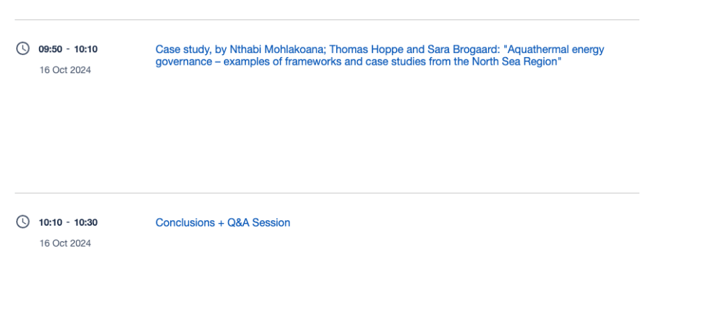 - Case study, by Nthabi Mohlakoana, Thomas Hoppe and Sara Brogaard : “Aquathermal energy governance – examples of frameworks and case studies from the North Sea Region”: